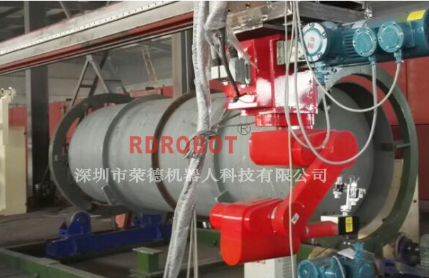 機(jī)器人平移行走,配合機(jī)架整體前后移動,增大了機(jī)器人噴涂范圍,半徑1.3M的機(jī)器人就可以把整個產(chǎn)品噴好,適用于大型的、笨重的罐體工件,如下圖所示:
